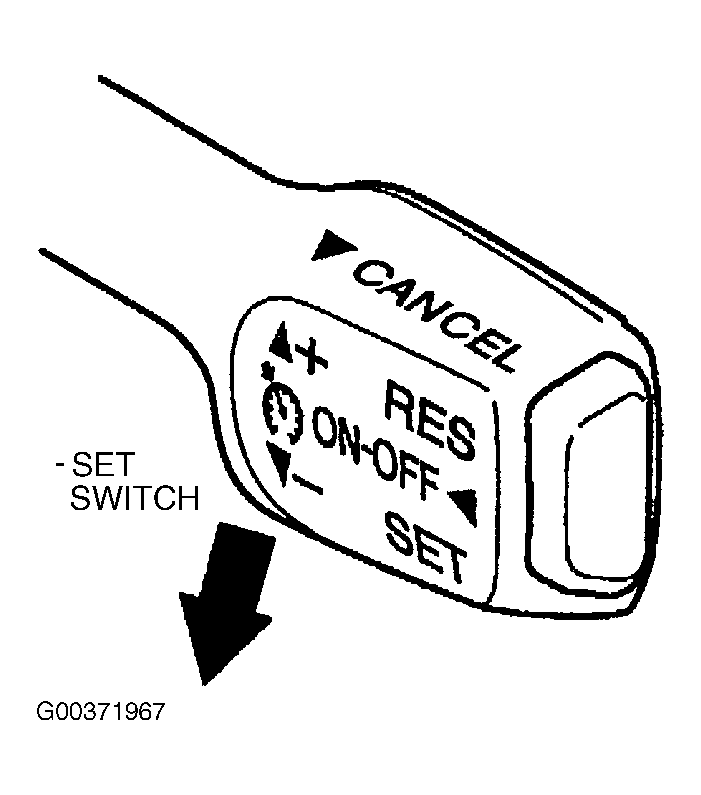 Push the lever down in the "-/SET" direction and hold it. See Figure. Release the lever when the desired speed is attained. while the lever is held down, the vehicle speed will gradually decrease.
