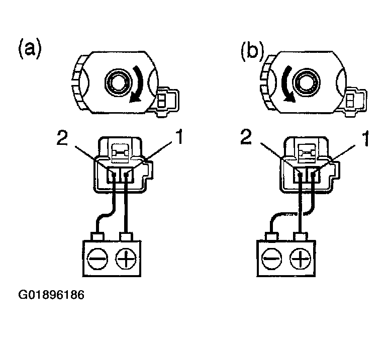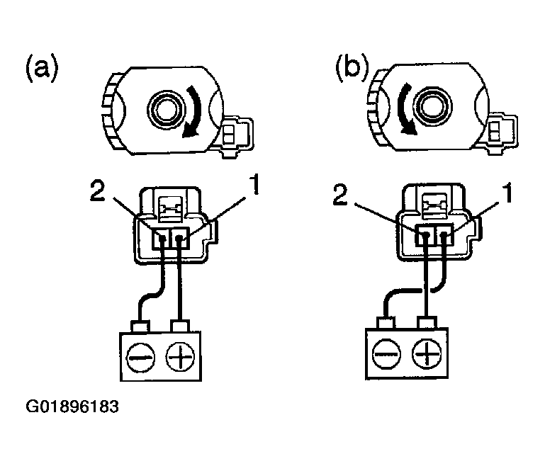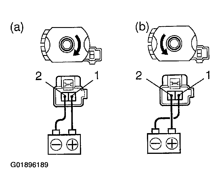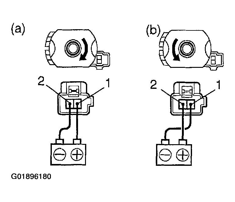 - Connecting the positive (+) lead from the battery to terminal 1 and the negative (-) lead to terminal 2, check that the lumbar support moves to release side.