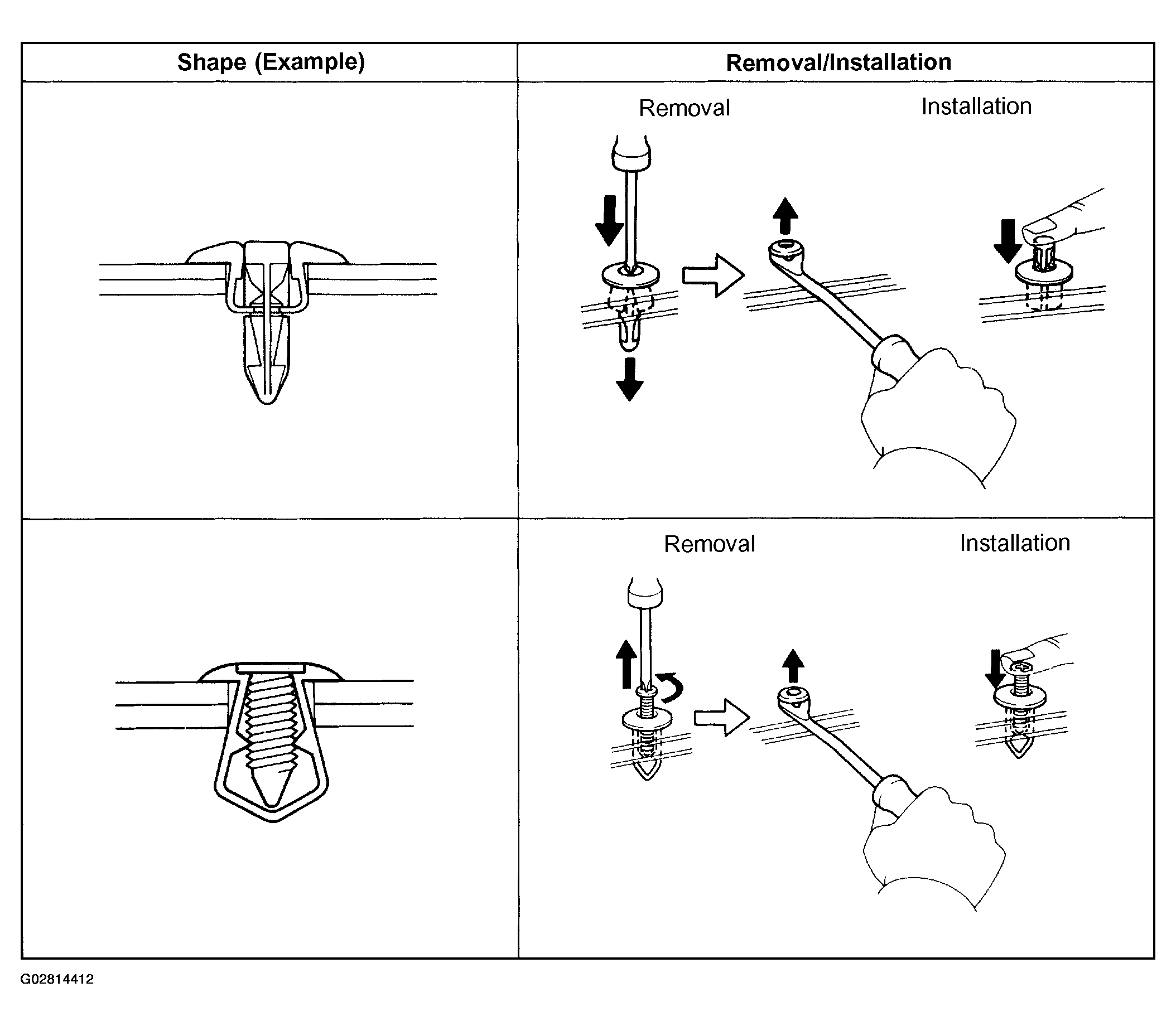 - The removal and installation methods of typical clips used in body parts are shown in Fig 6 and Fig 7.