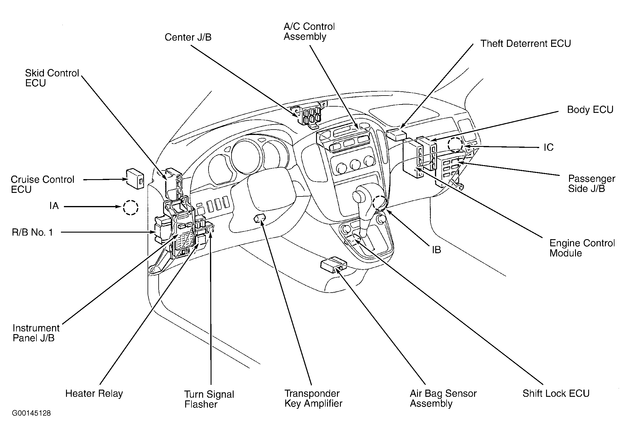 | Skid Control ECU | Above instrument panel J/B. See Figure. |