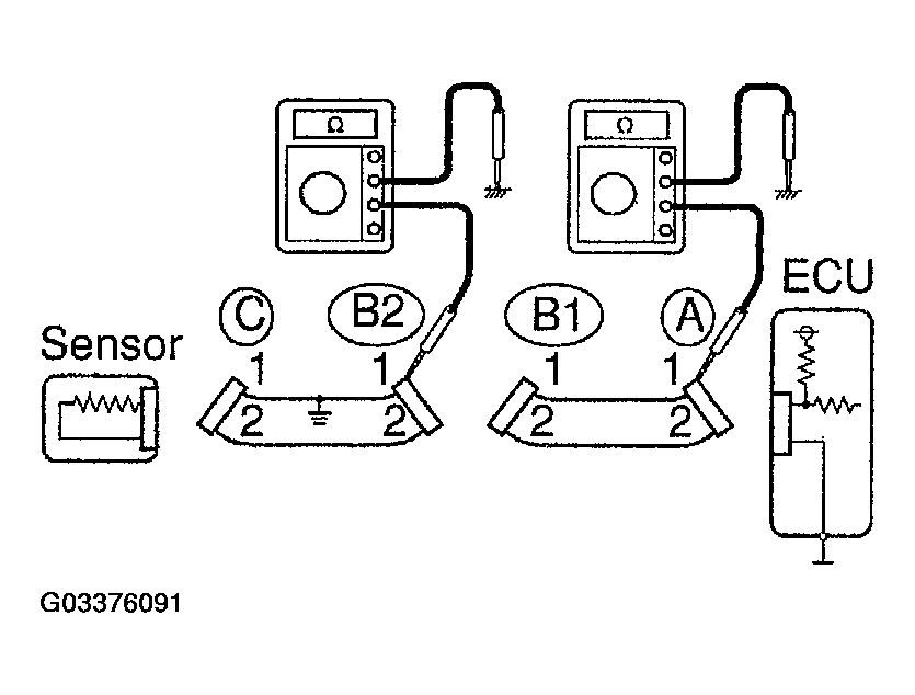 Therefore, it is found out that there is an open circuit between terminal 1 of connector "B2" and terminal 1 of connector "C".