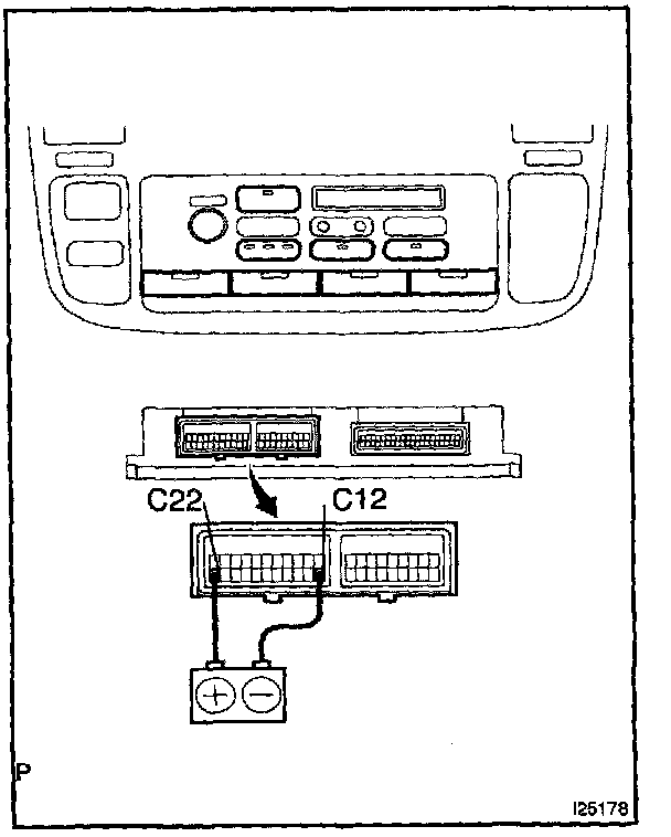 a. Connect the positive (+) lead from the battery to terminal C22 and negative (-) lead to terminal C12.
