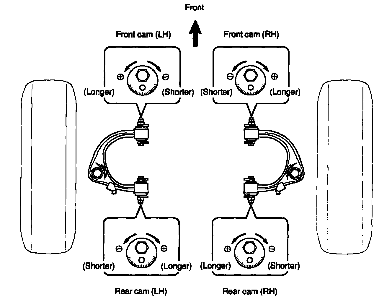 b. Adjust the camber and caster by front and/or rear adjusting cams.