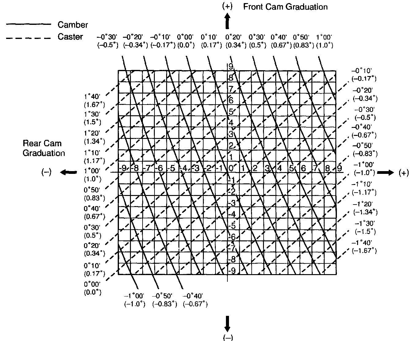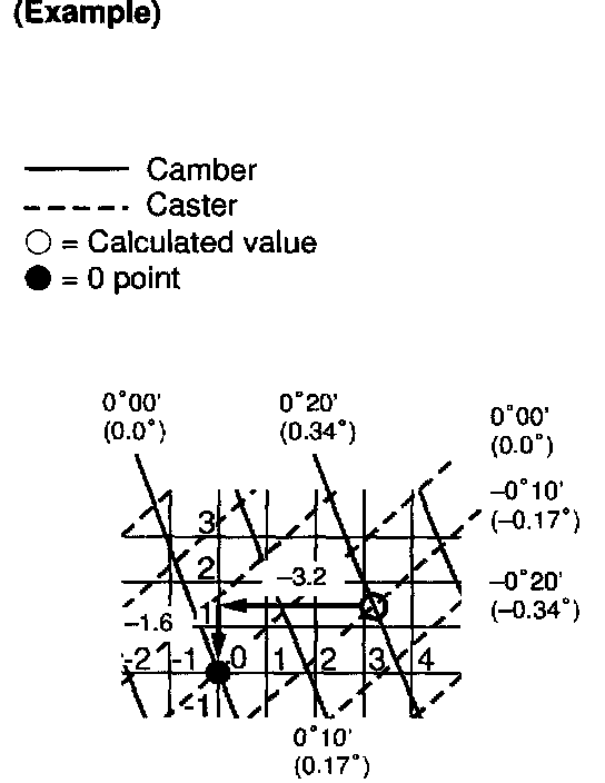 3. As shown in the chart, read the distance from the marked point to 0 point, and adjust the front and/or rear adjusting cams accordingly.