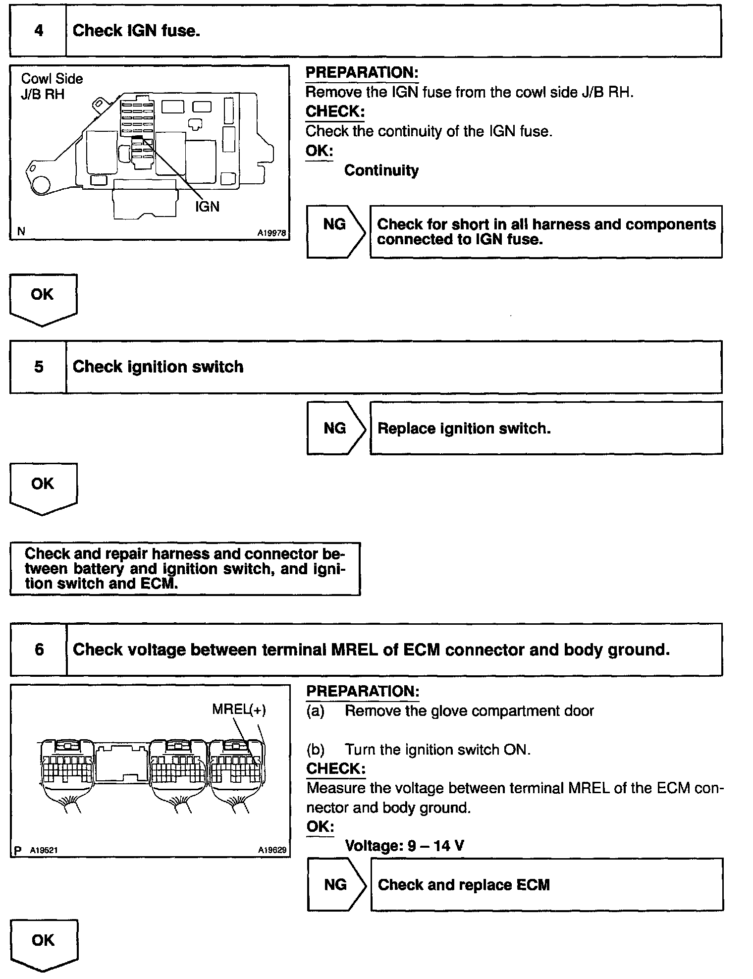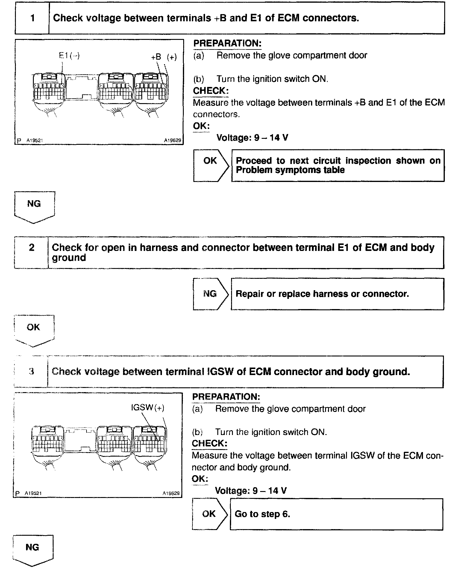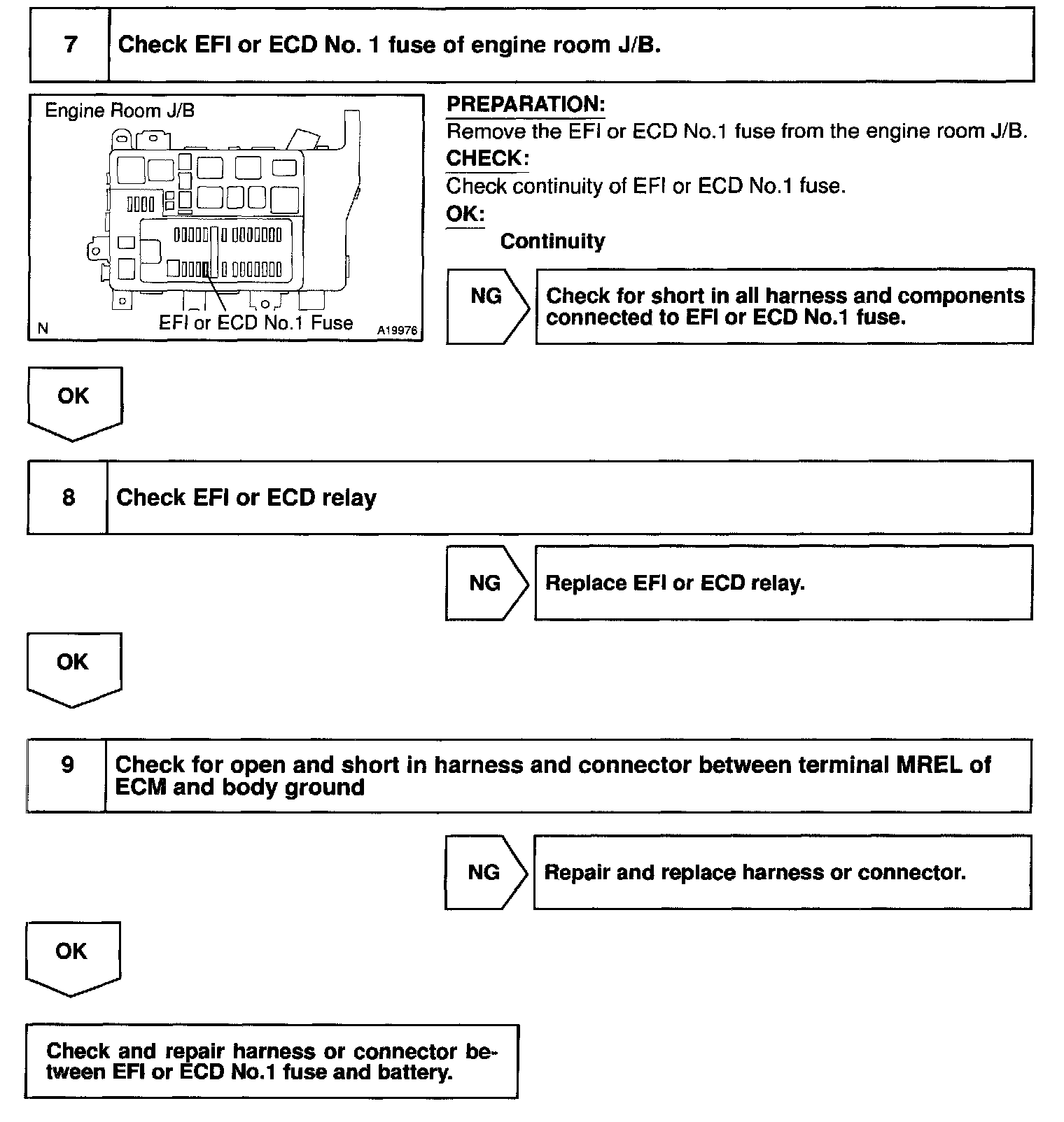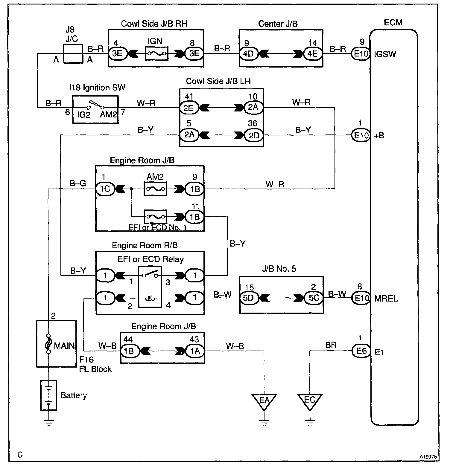 This signal causes current to flow to the coil, closing the contacts of the EFI or ECD relay and supplying power to terminal +B of the ECM.