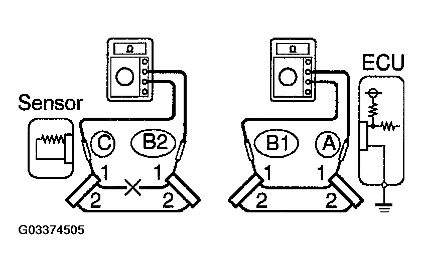 Therefore, it is found out that there is an open circuit between terminal 1 of connector "B2" and terminal 1 of connector "C".
