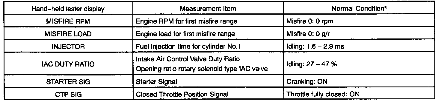 ENGINE OPERATING CONDITIONNOTE: The values given below for "Normal Condition" are representative values, so a vehicle may still be normal even if its value from those listed here. So do not decide whether a part is faulty or not solely according to the "Normal Condition" here.