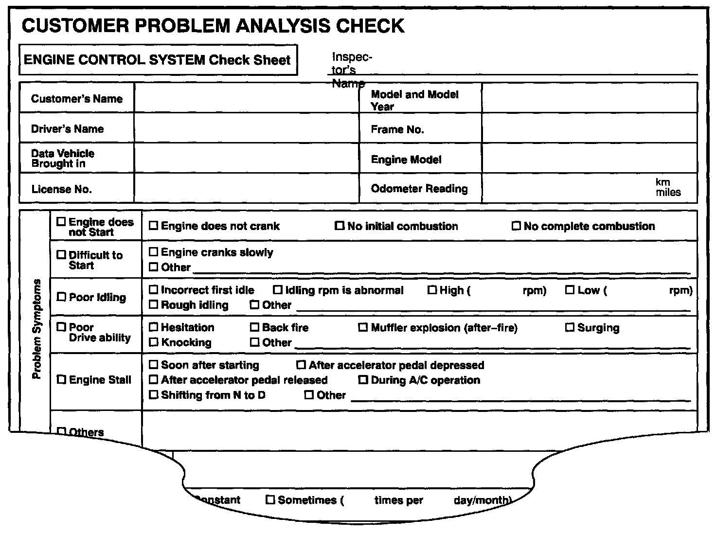 The following 5 items are important points in the problem analysis. Past problems which are thought to be unrelated and the repair history, etc. may also help in some cases, so as much information as possible should be gathered and its relationship with the problem symptoms should be correctly ascertained for reference in troubleshooting. A customer problem analysis table is provided in the applicable diagnostics section for each system for your use.