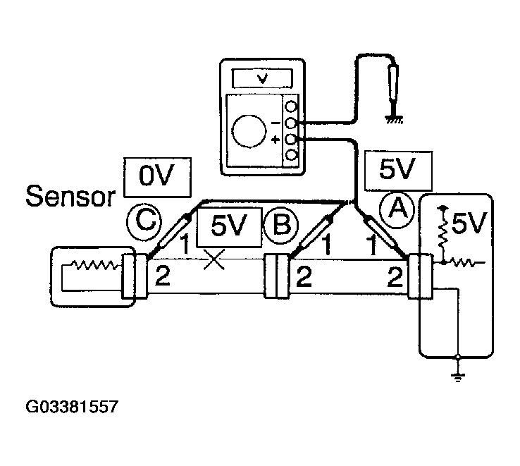 As shown in Fig 12, with each connector still connected, measure the voltage between body ground and terminal 1 of connector "A" at the ECU 5V output terminal, terminal 1 of connector "B", and terminal 1 of connector "C", in that order.