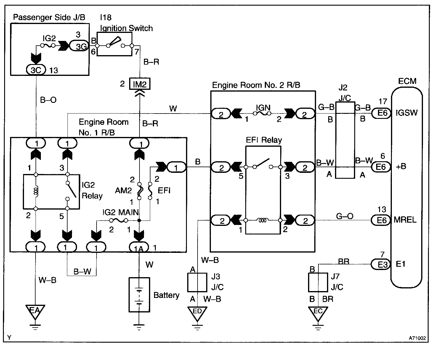 When the ignition switch is turned ON, battery positive voltage is applied to terminal IGSW of the ECM and the EFI main relay (Marking: EFI) control circuit in the ECM sends a signal to terminal MREL of the ECM switching on the EFI main relay.