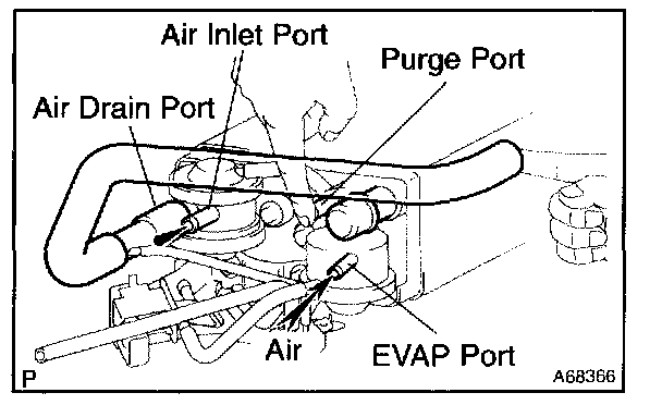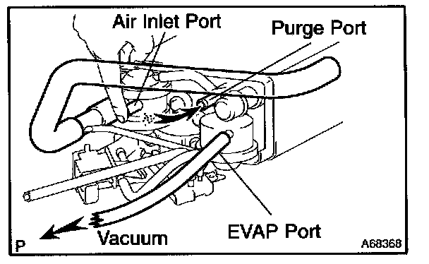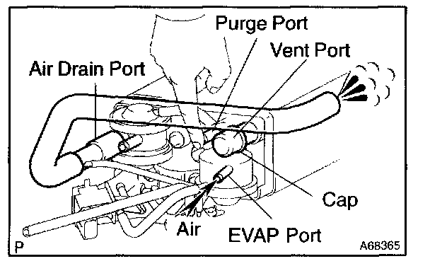 5. While holding the air inlet port closed, apply vacuum (3.43 kpa, 25.7 mmHg, 1.01 in.Hg) to the EVAP port to check that air flows into the purge port.