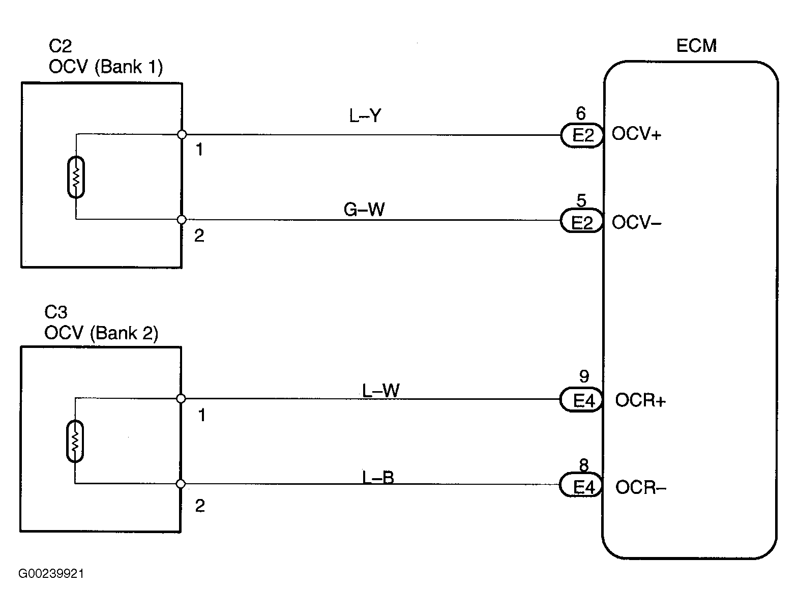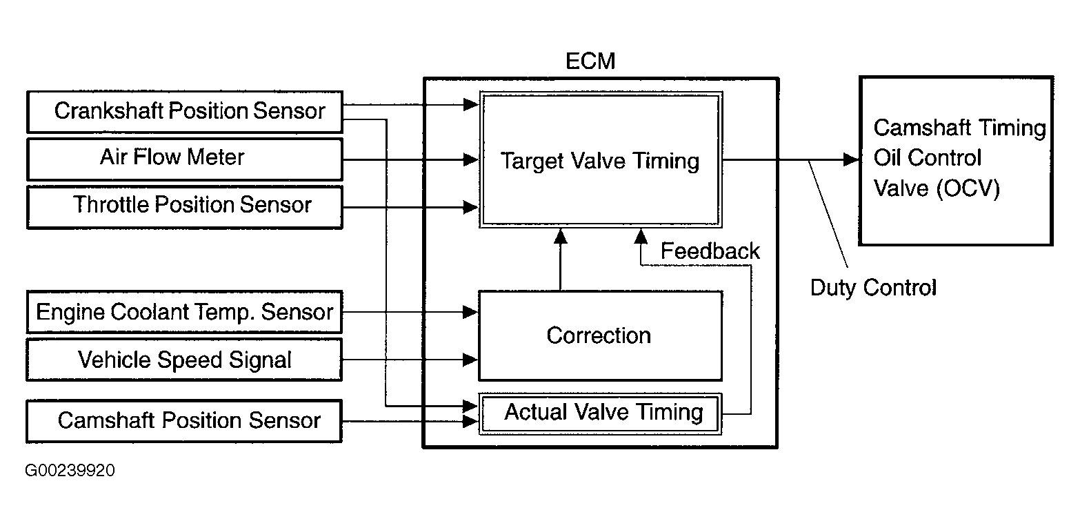 The VVT system controls the intake camshaft to provide the optimal valve timing for every driving condition. This control is performed based on the signals and such conditions as intake air volume, throttle position and engine coolant temperature. The ECM controls the oil control valve (OCV), based on the signals output from the sensors. The VVT controller regulates the intake camshaft angle using oil pressure through the OCV. As a result, the relative position between the camshaft and the crankshaft becomes optimal, and the engine torque improves, fuel economy improves, and exhaust emissions decrease under overall driving conditions. Also, the ECM detects the actual valve timing using the signals from the camshaft position sensor and the crankshaft position sensor, and performs feedback control. This is how target valve timing is achieved by the ECM. DTC is detected when there is an open or short in oil control valve circuit. See Fig 1 and Fig 2 . Possible causes are: