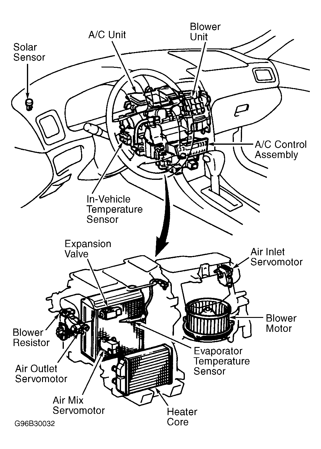 An Electronic Control Unit (ECU), located within A/C-heater control assembly, automatically controls all A/C and heating functions. Manual controls allow the driver to select air distribution mode and desired temperature. In addition to normal A/C system components, automatic A/C-heater system includes various motors, controls, and sensors. See Fig 1. A replaceable air filter is located in front of A/C evaporator. System has self-diagnostic capabilities.