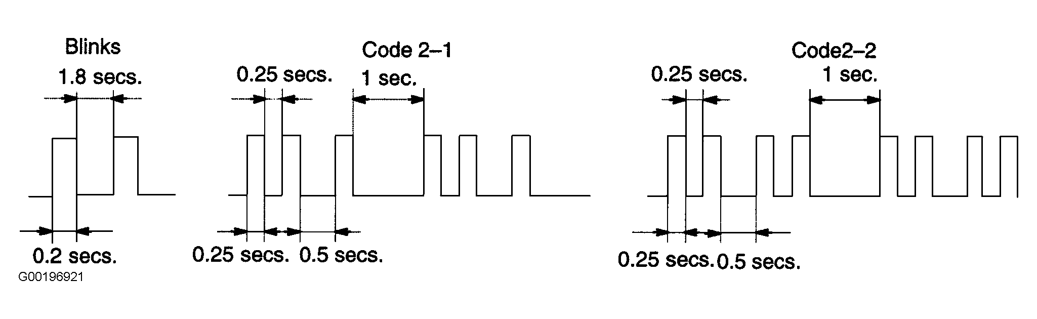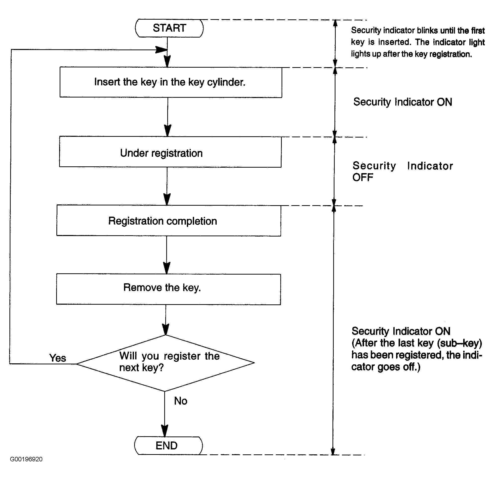 - When a key is not inserted in the key cylinder in the automatic registration mode, the security indicator always lights on. When the immobilizer system operates normally and the key is pulled out, the security indicator blinks. See Fig 2. When the key code registration could not be performed in the automatic registration mode, code 2-1 is output from the security indicator and when inserting the already registered key, code 2-2 is output.