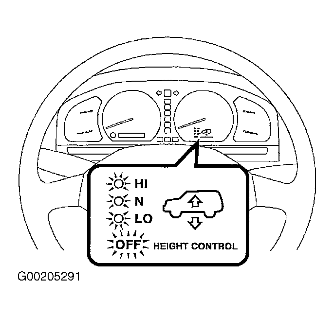 - Check that height control indicator light and height control off indicator light illuminate for 2 seconds. See Fig 1. If indicator does not light, inspect the height control off indicator light circuit and height control indicator light circuit. See SYSTEM TESTS .