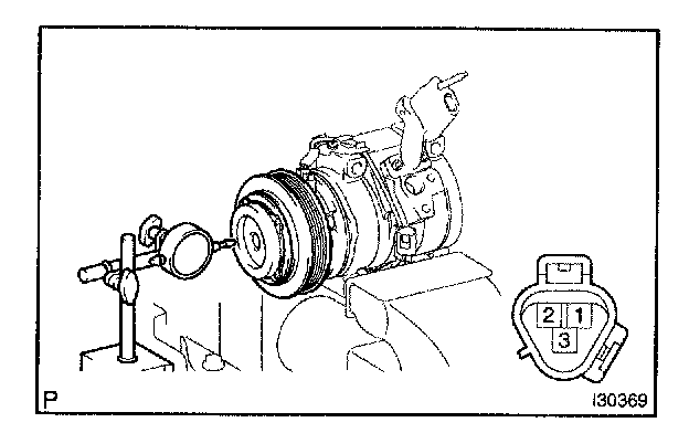 b. Connect the battery positive lead to the terminal 3 of magnet clutch connector and the negative lead to the earth wire. Turn on and off the magnet clutch and measure the clearance.