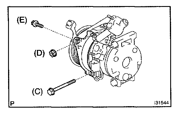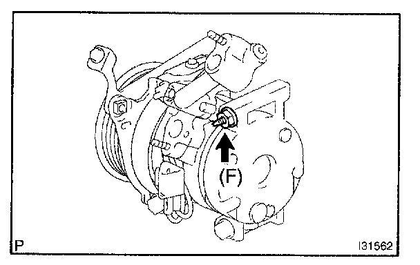 c. Tighten the compressor and magnetic clutch with the bolt (F).