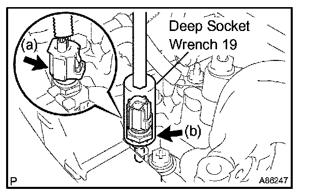 (a) Using a deep socket wrench 19, install a new gasket and the engine coolant temperature sensor.