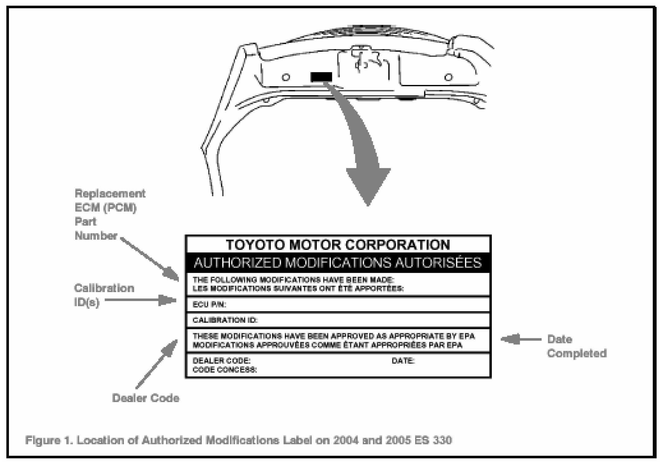1. Check for the Authorized Modifications Label affixed to the vehicle in the location shown in Figure 1. Confirm if ECM (PCM) calibration has been updated. If not latest ECM (PCM) calibration-go to step 2.