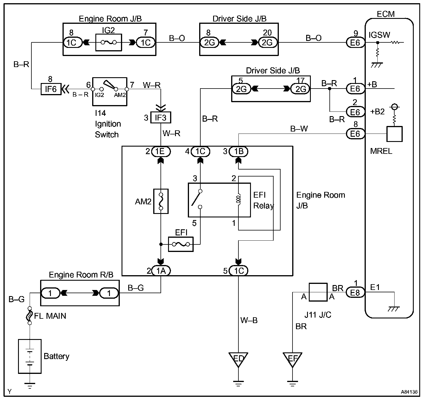When the ignition switch is turned to ON, battery voltage is applied to terminal IGSW of the ECM. The ECM "MREL" output signal causes current to flow to the coil, closing the contacts of the EFI relay and supplying power to terminal +B of the ECM.