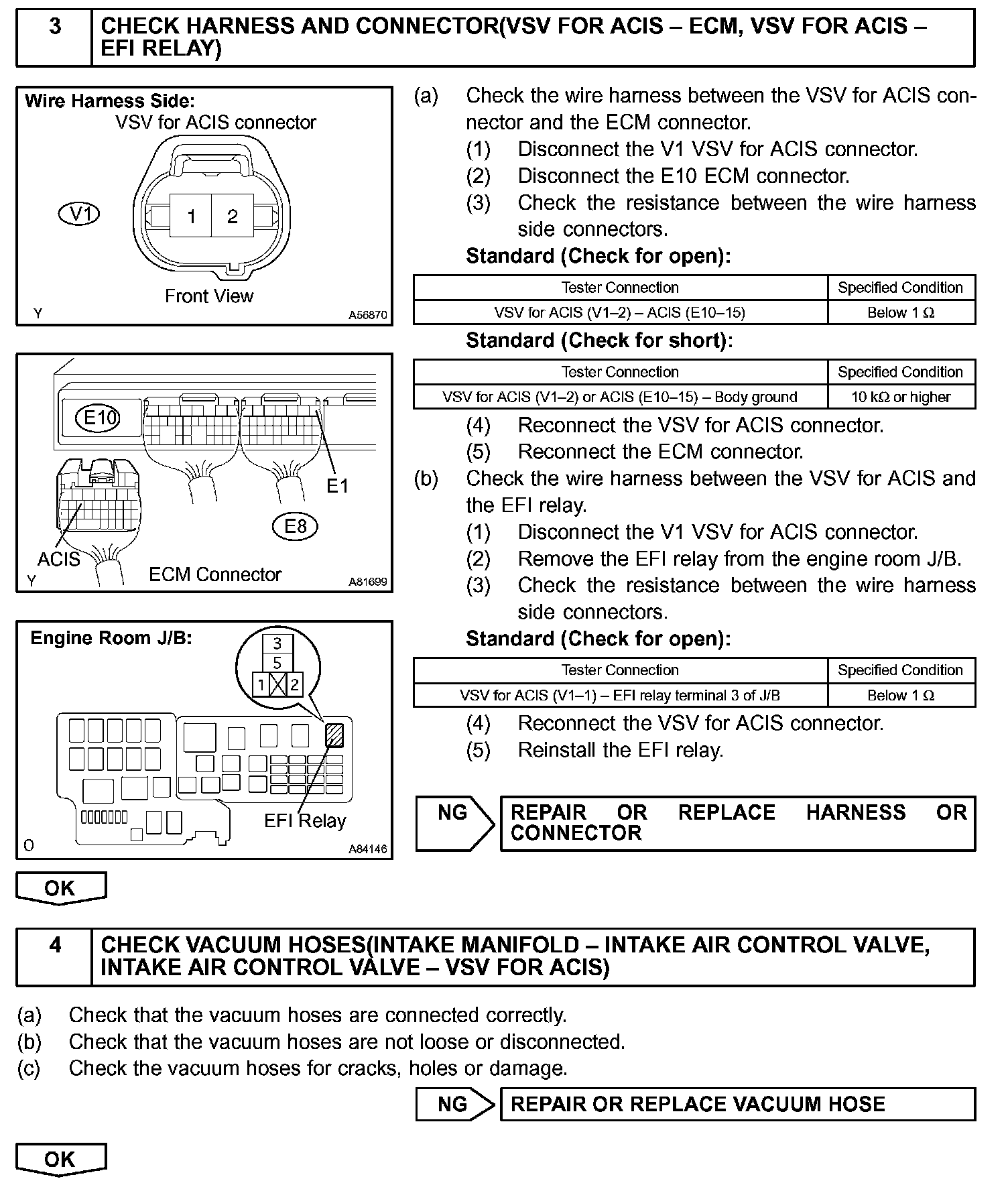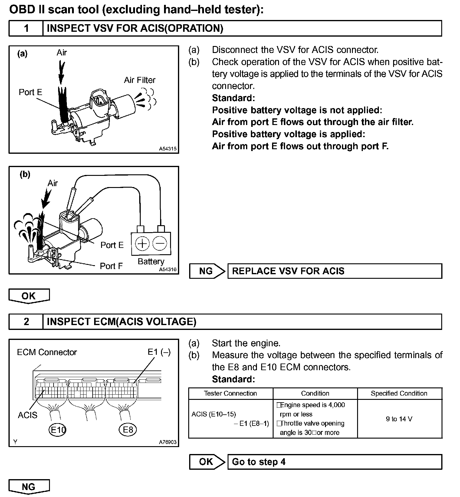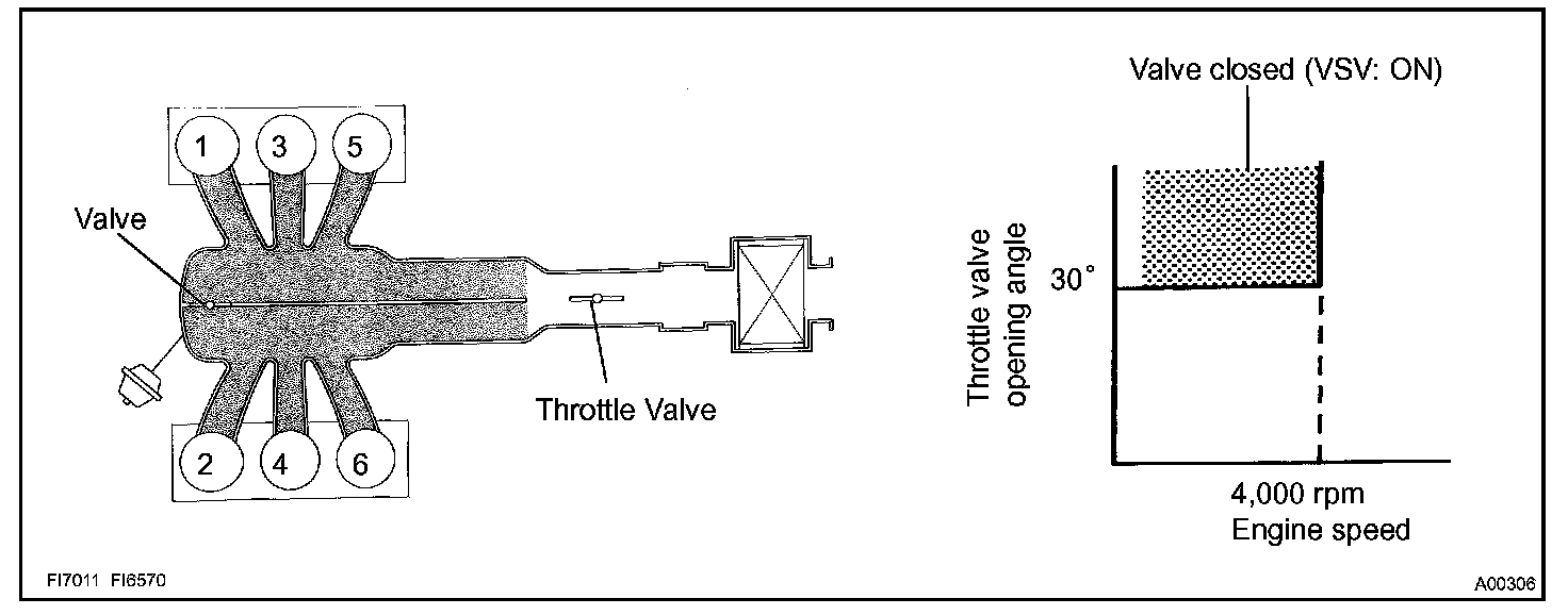 The ECM opens and closes the Intake Air Control valve in response to engine speed (RPM/NE).This system improves intake manifold tuning for better efficiency at low and high engine rpm. When the engine speed is 4,000 rpm or less and the throttle valve opening angle is 30 ° or more, the ECM turns the VSV ON or OFF to operate the intake air control valve.