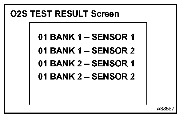 b. On the tester screen, enter the following menus: DIAGNOSIS/ CARB OBD II/O2S TEST RESULT. A list of the O2S equipped on the vehicle will be displayed.