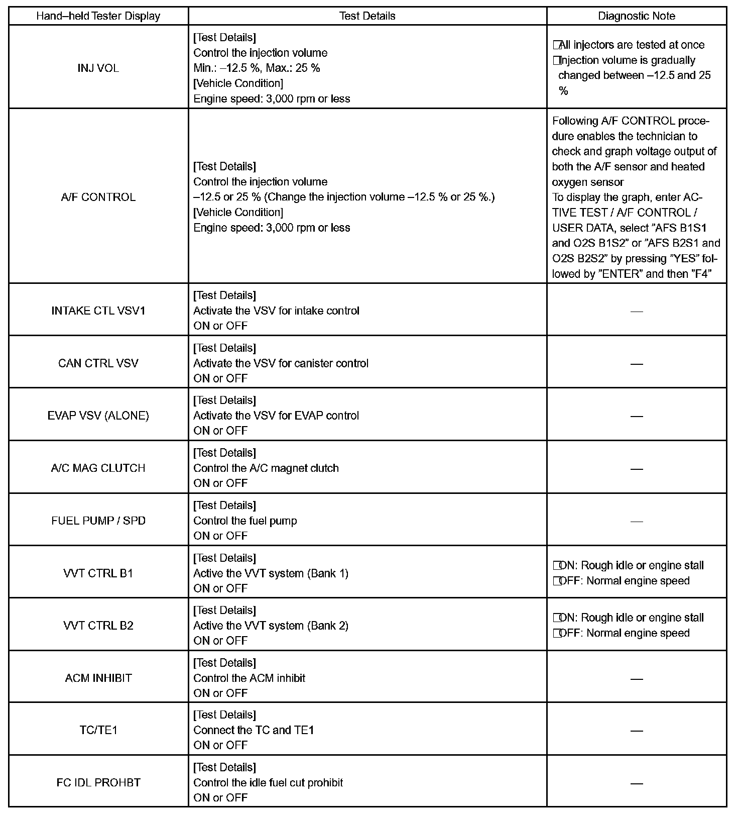 ACTIVE TESTHINT: Performing the ACTIVE TEST using the hand-held tester or the OBD II scan tool allows the relay, VSV, actuator and so on to operate without parts removal. Performing the ACTIVE TEST as a first step of troubleshooting is one method to shorten diagnostic time.