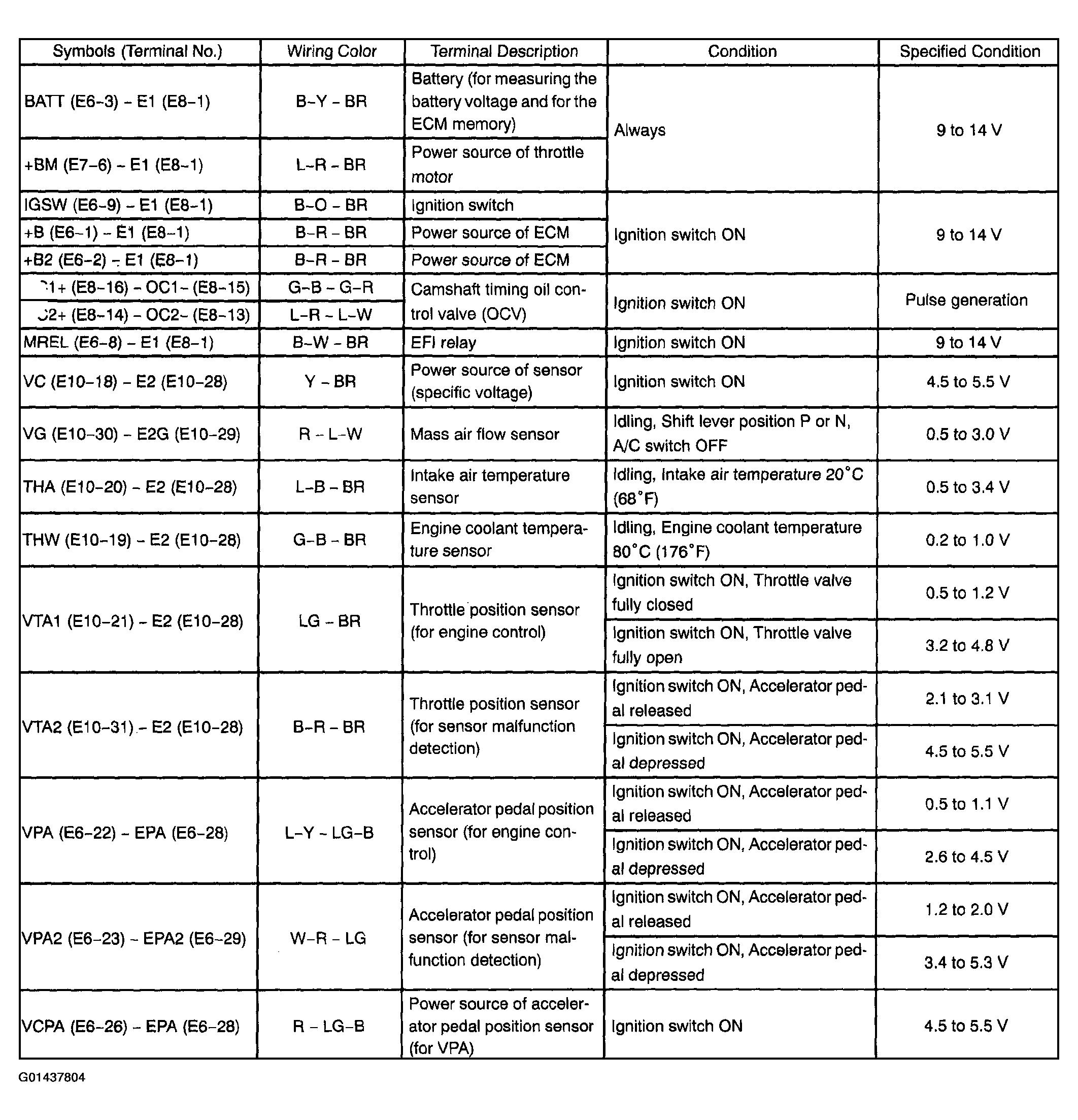 In the table, first follow the information under "Condition". Next look under "Symbol (Terminal No.)" for the terminals to be inspected. The standard voltage between the terminals is shown under "Specific Condition". Use the illustration above as a reference for the ECM terminals.