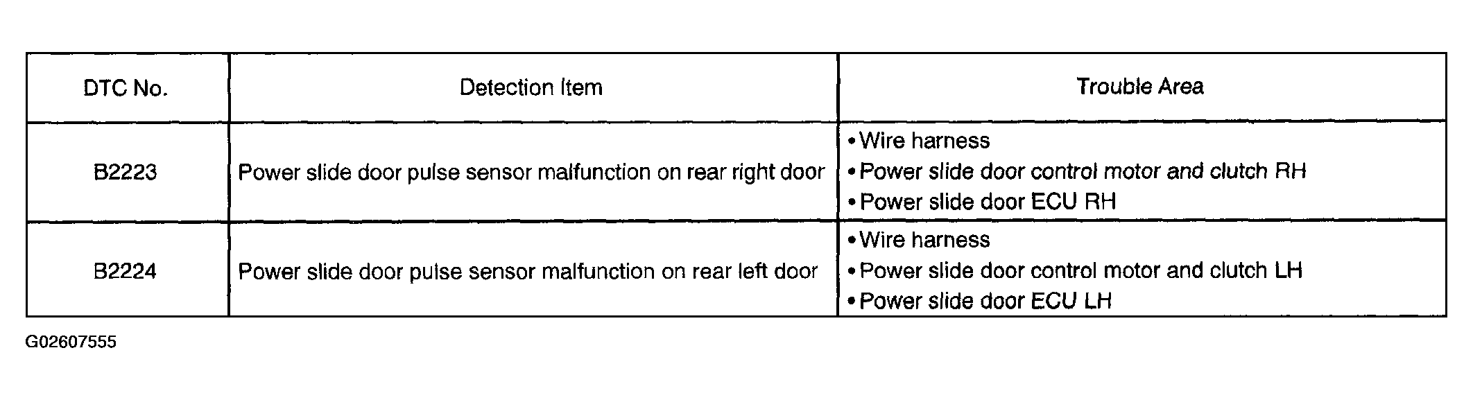 | DTC B2223 | POWER SLIDE DOOR PULSE SENSOR MALFUNCTION ON REAR RIGHT DOOR |