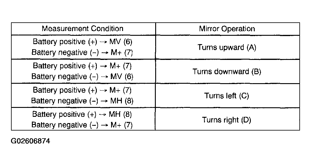 OUTER MIRROR SWITCH (LEFT SIDE)Terminal No. Switch Position Specified Condition - OFF 10 kΩ or higher 4-8 UP Below 1 Ω 6-7 4-7 DOWN Below 1 Ω 6-8 5-8 LEFT Below 1 Ω 6-7 5-7 RIGHT Below 1 Ω 6-8 If the result is not as specified, replace the switch assy.