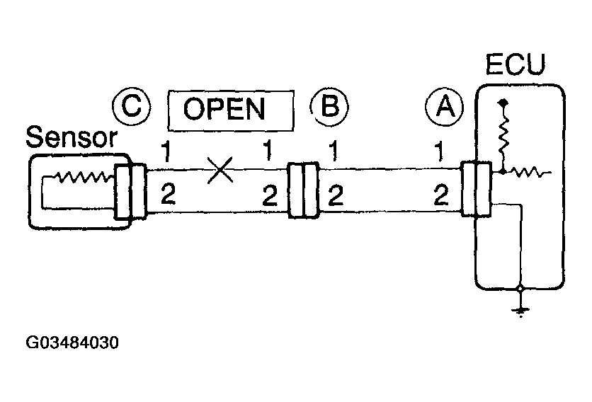 Therefore, the cause is an open circuit between terminal 1 of connector B2 and terminal 1 of connection C.