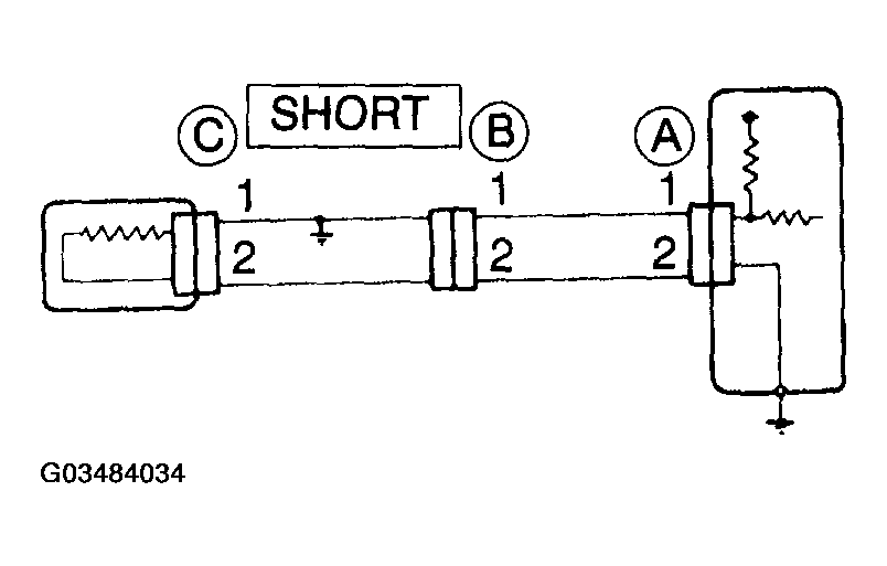 - Disconnect connectors A and C and measure the resistance between terminals 1 and 2 of connector A and the body ground.