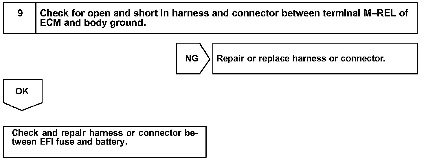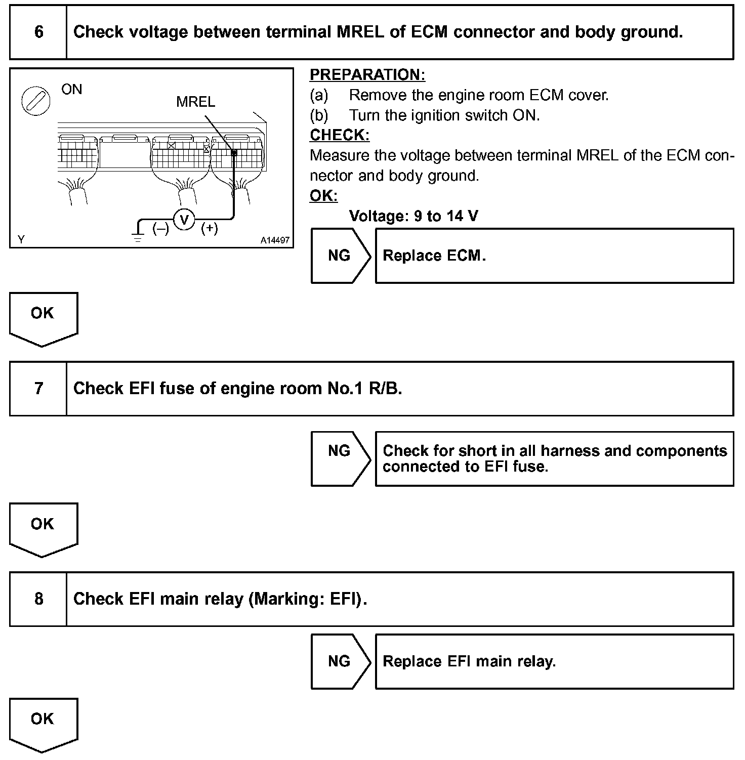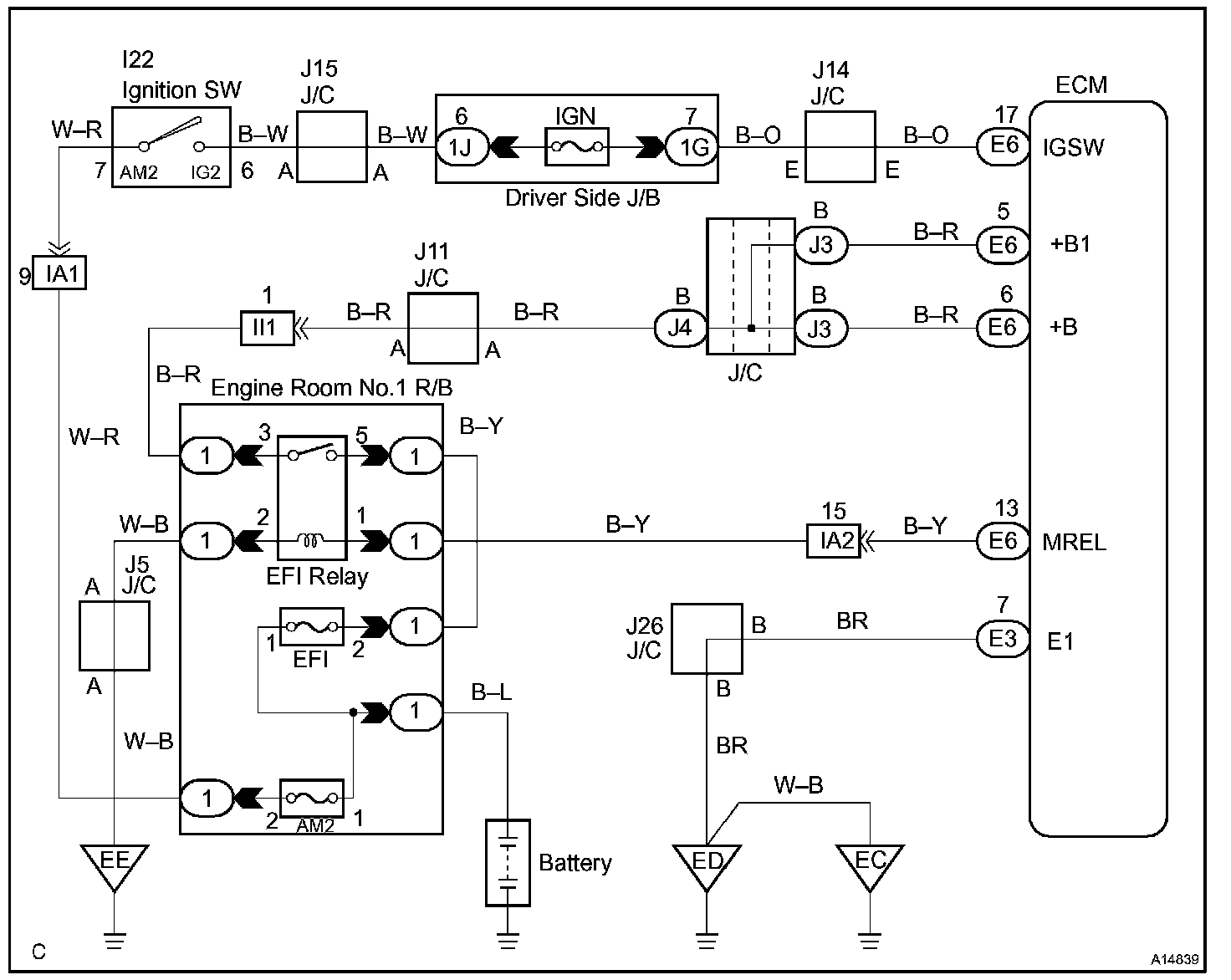 When the ignition switch is turned ON, battery voltage is applied to terminal IGSW of the ECM. The ECM "MREL" output signal causes current to flow to the coil, closing the contacts of the EFI relay and supplying power to terminal +B of the ECM.