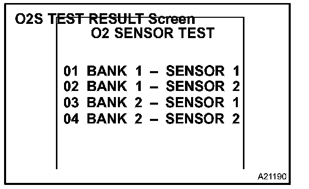 b. On the tester screen, select the following menus: DIAGNOSIS/ CARB OBDII/O2S TEST RESULT. A list of the O2S equipped on the vehicle will be displayed.