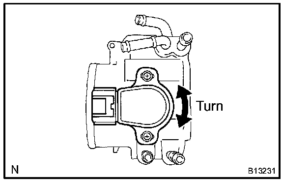 4. While reading the valve of the throttle valve opening percentage (THROTTLE POS) of the CURRENT DATA, turn the throttle position sensor slowly to left and right and set the sensor at the center value of the standard value, and then tighten the screws.