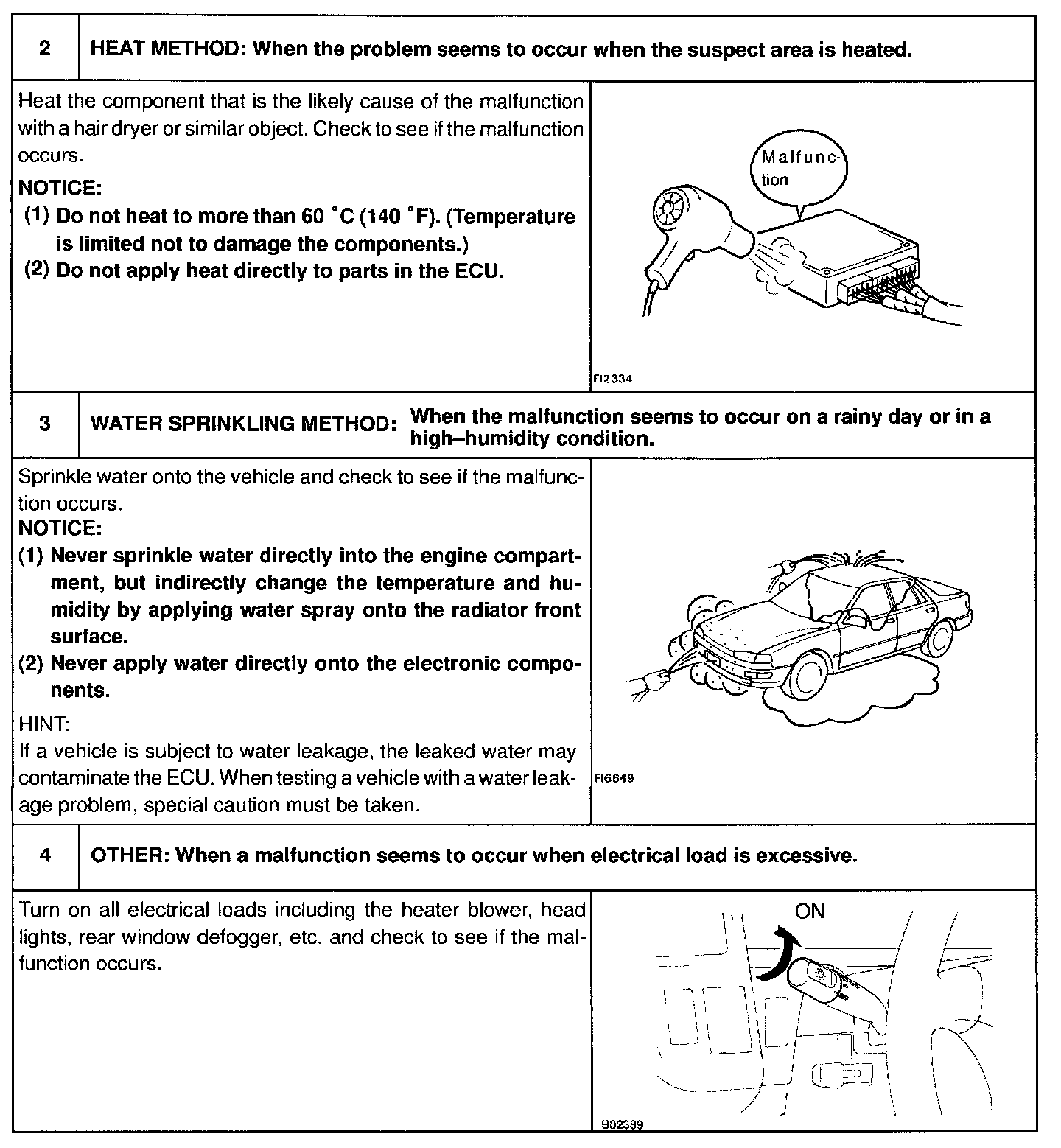 SYMPTOM SIMULATIONThe most difficult case in troubleshooting is when there are no problem symptoms occurring. In such cases, a thorough customer problem analysis must be carried out, then simulate the same or similar conditions and environment in which the problem occurred in the customer's vehicle. No matter how much experience a technician has, or how skilled he may be, if he proceeds to troubleshoot without confirming the problem symptoms he will tend to overlook something important in the repair operation and make a wrong guess somewhere, which will only lead to a standstill. For example, for a problem which only occurs when the engine is cold, or for a problem which occurs due to vibration caused by the road during driving, etc., the problem can never be determined so long as the symptoms are confirmed with the engine hot condition or the vehicle at a standstill. Since vibration, heat or water penetration (moisture) is likely cause for problem which is difficult to reproduce, the symptom simulation tests introduced here are effective measures in that the external causes are applied to the vehicle in a stopped condition.