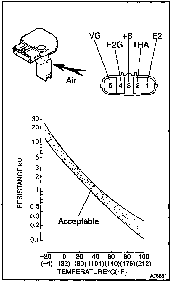 1. Using an Ohmmeter, measure resistance between the terminals 2 (THA) and 1 (E2).