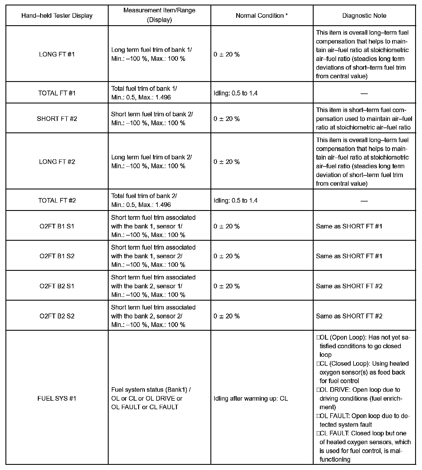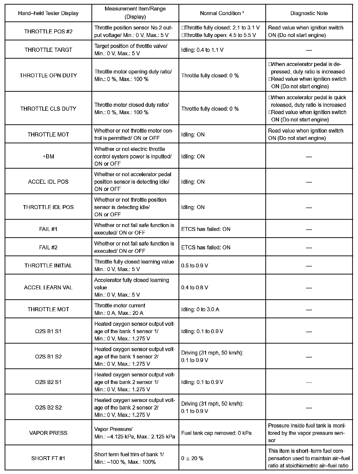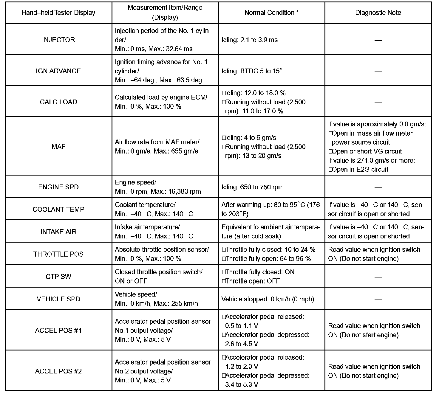 NOTE: In the table, the values listed under "Normal Condition" are reference values. Do not depend solely on these reference values when deciding whether a part is faulty or not.