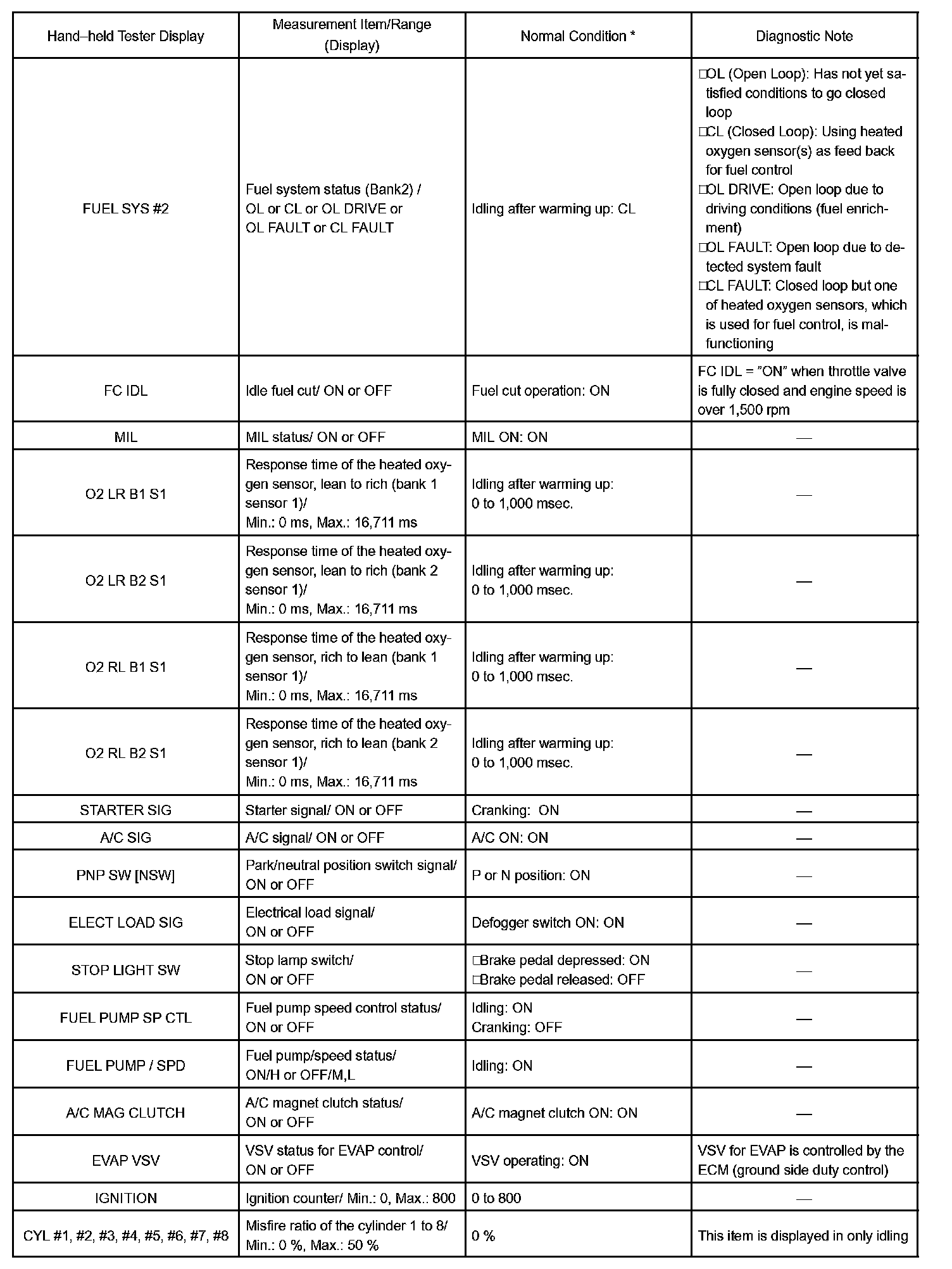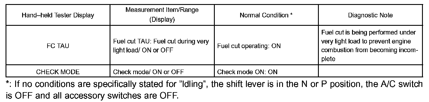 DATA LISTHINT: Using the hand-held tester DATA LIST allows switch, sensor, actuator and other item values to be read without removing any parts. Reading DATA LIST early in troubleshooting is one way to shorten labor time.