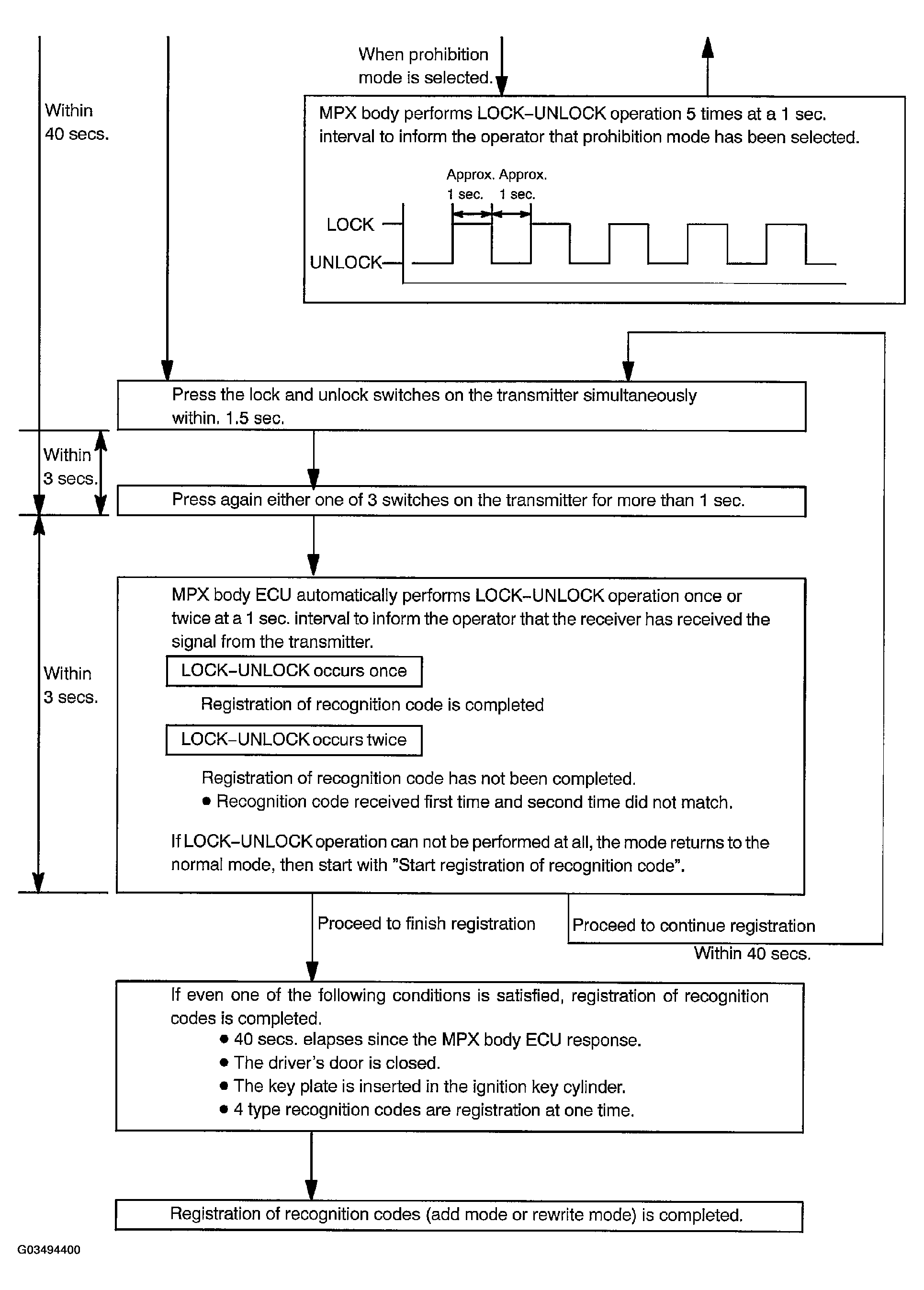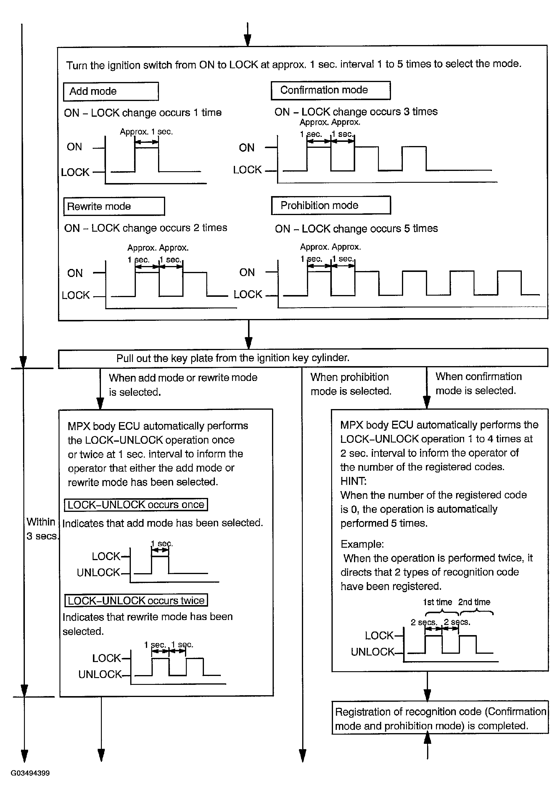 - The add mode is used to retain codes already registered while you register new recognition codes. This mode is used when adding a transmitter. However, if the number of registered codes exceeds 4 codes, previously registered codes are correspondingly erased in order, starting from the first registered code.
