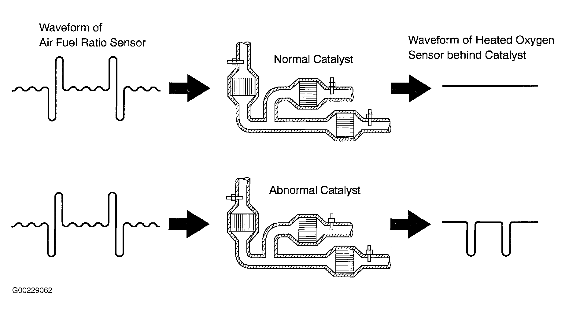 ECM observes waveform of heated oxygen sensor, located behind catalyst, to determine whether catalyst performance has deteriorated. If catalyst is functioning normally, waveform of heated oxygen sensor switches back and forth between rich and lean much more slowly. When waveform of heated oxygen sensor alternates flatteringly between rich and lean, it indicates that catalyst performance has deteriorated (2 trip detection logic). See Fig 1. Possible causes are: