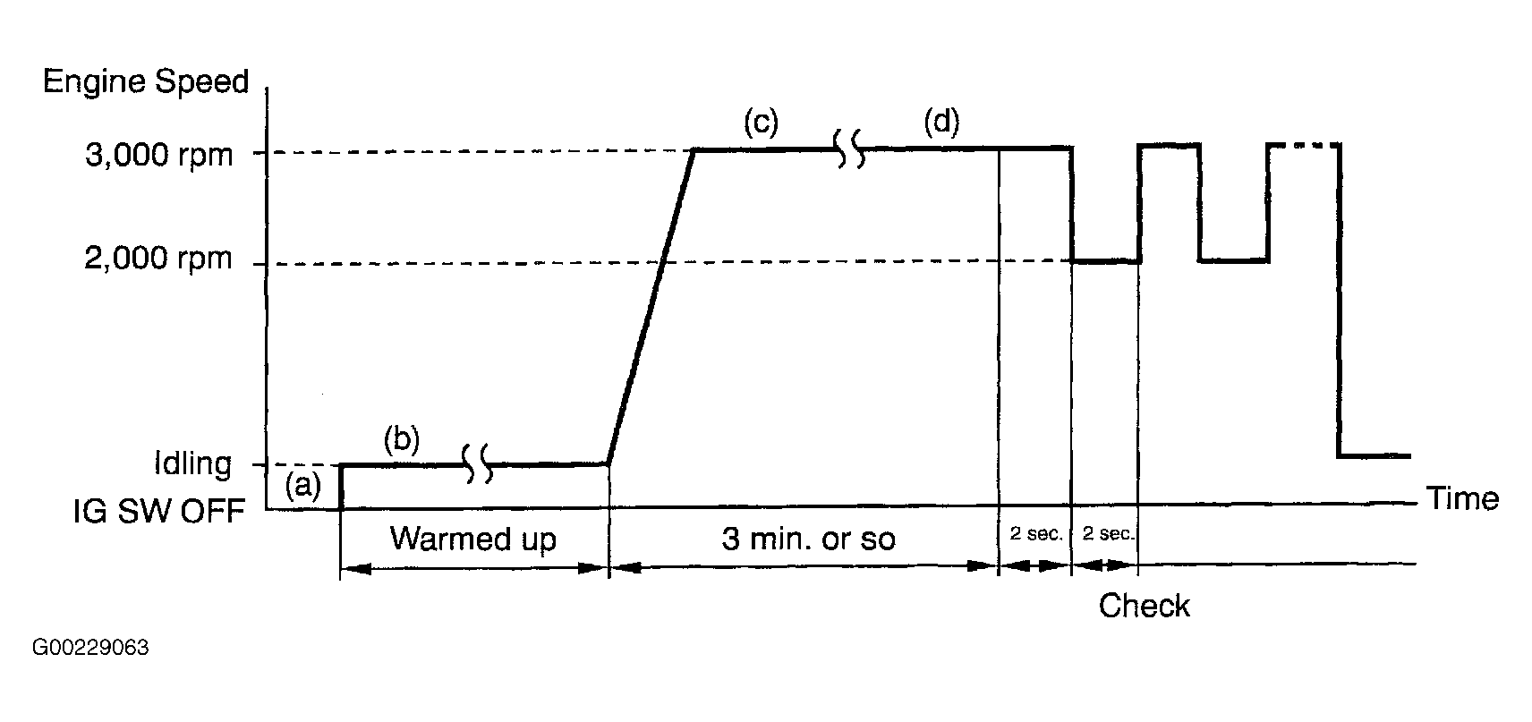 - Race engine at 3,000 RPM for 2 seconds and 2,000 RPM for 2 seconds alternately and check the waveform of the heated oxygen sensor (bank 1 sensor 2). See Fig 1.