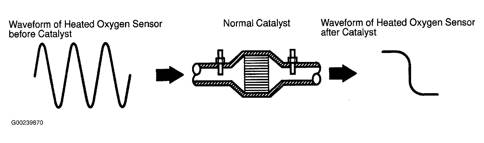 ECM compares waveform of heated oxygen sensor No. 1 (located before catalytic converter) with waveform of heated oxygen sensor No. 2 (located after catalytic converter) to determine if catalytic converter performance has deteriorated. If both waveforms change at similar rate, catalytic converter performance has deteriorated. DTCs are set when, after engine and catalyst are warmed up, and while vehicle is driven within set vehicle and engine speed range, waveform of heated oxygen sensors have same amplitude. See Fig 1. Possible causes are: