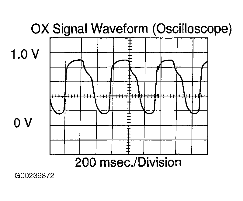 - After confirming that the waveform of the heated oxygen sensor bank 1, 2 sensor 1 (OX1A, OX2A), oscillate around 0.5 volts during feedback to the ECM, check the waveform of the heated oxygen sensor bank 1, 2 sensor 2 (OX1B, OX2B). If there is a malfunction in the system, the waveform of the heated oxygen sensor bank 1, 2 sensor 2 (OX1B, OX2B) is almost the same as that of the heated oxygen sensor (bank 1, 2 sensor 1 OX1A, OX2A). See Fig 2. There are some cases where, even though a malfunction exists, MIL may either light up or not light up.
