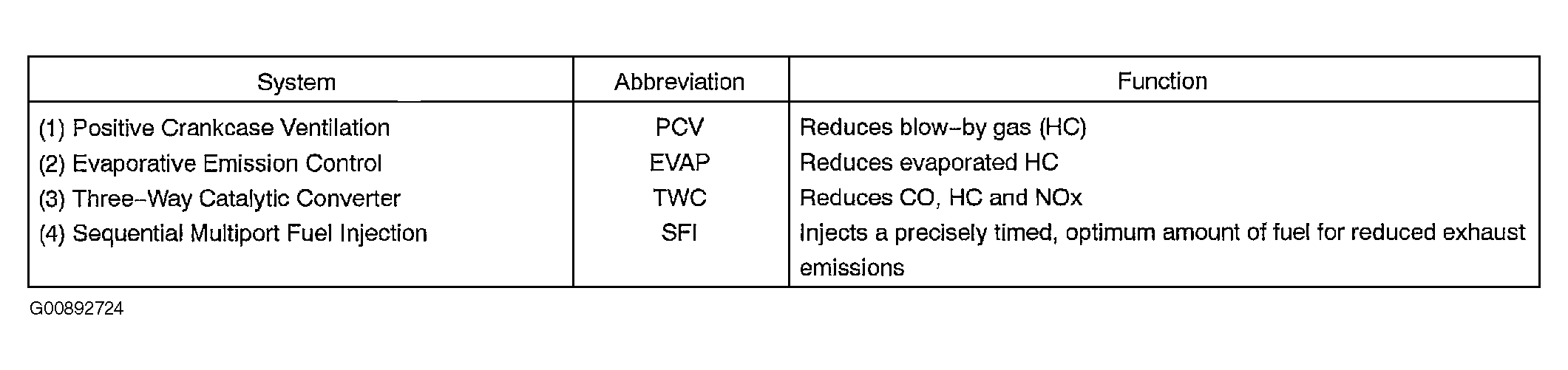 The emission control systems are installed to reduce the amount of CO, HC and NOx exhausted from the engine (3) and (4), to prevent the atmospheric release of blow-by gas-containing HC (1) and evaporated fuel containing HC being released from the fuel tank (2).
