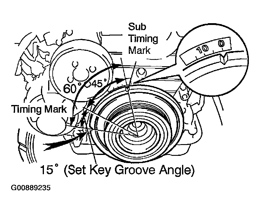 At this time, the crankshaft pulley set key groove and the timing mark (TDC mark) of the crankshaft pulley are as shown in Fig 7 .