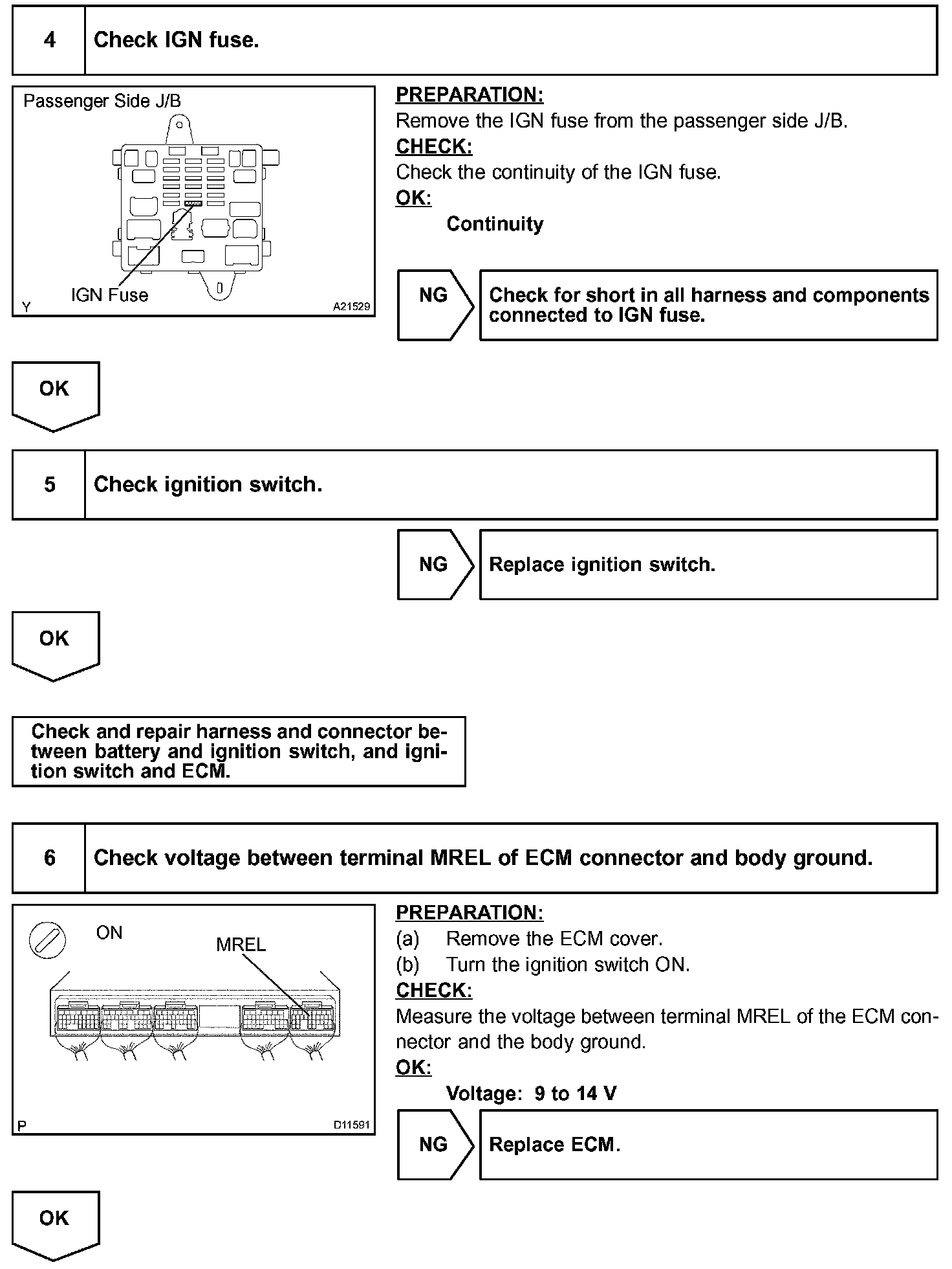 This signal causes current to flow to the coil, closing the contacts of the EFI main relay and supplying power to terminals +B and B2 of the ECM.