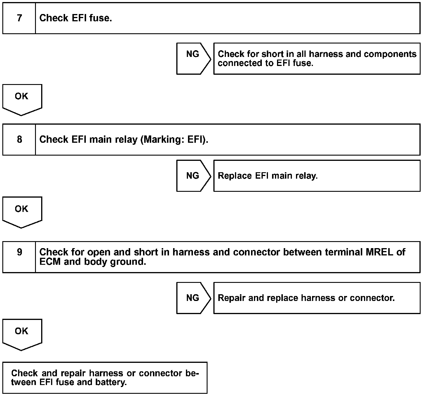CIRCUIT DESCRIPTIONWhen the ignition switch is turned ON, battery positive voltage is applied to terminal IGSW of the ECM and the EFI main relay (Marking: EFI) control circuit in the ECM sends a signal to terminal MREL of the ECM, switching on the EFI main relay.