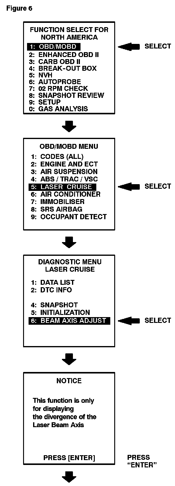 - If the L/C Option Flag is NOT set to "YES" in the Data List after performing the L/C Option Flag selection procedure and the beep is heard, perform the "INITIALIZATION" option from the "LASER CRUISE" menu on the Diagnostic Tester.