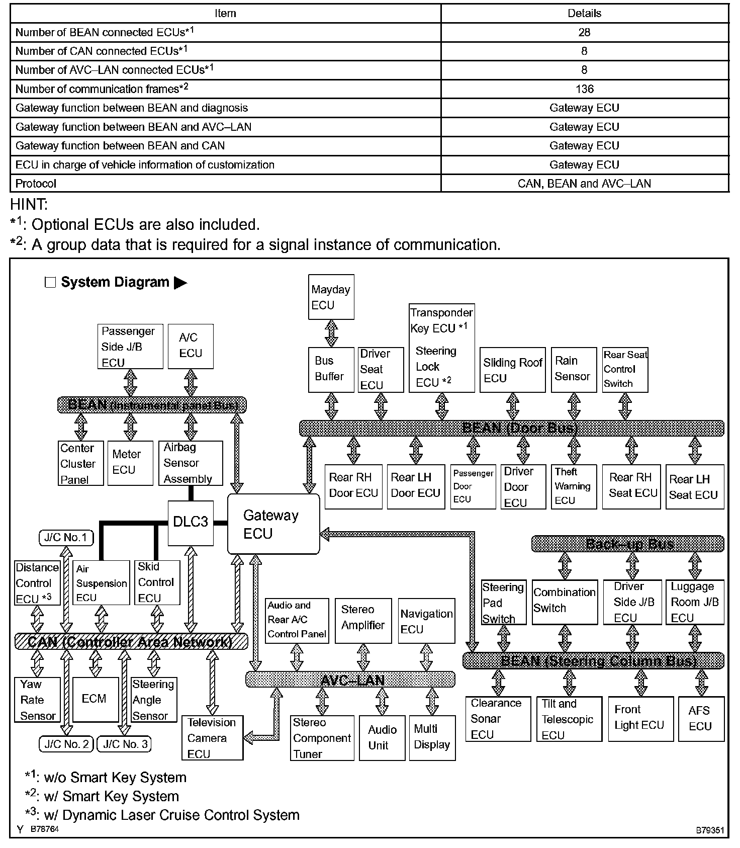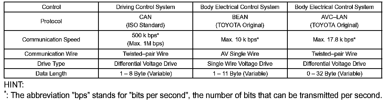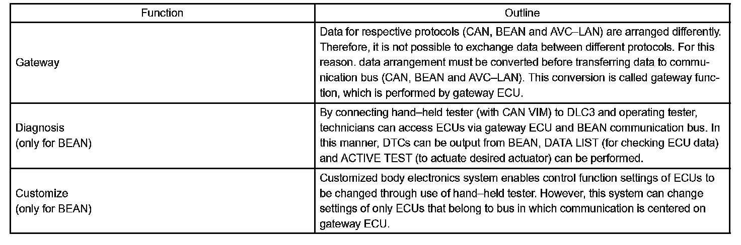 The protocols, which are the rules for establishing data communication, differ between the CAN, BEAN and the AVC-LAN. If ECUs use different types of data such as communication speed, communication wire, and signals, they will be unable to understand each other. Therefore, protocols (rules) must be established among them.